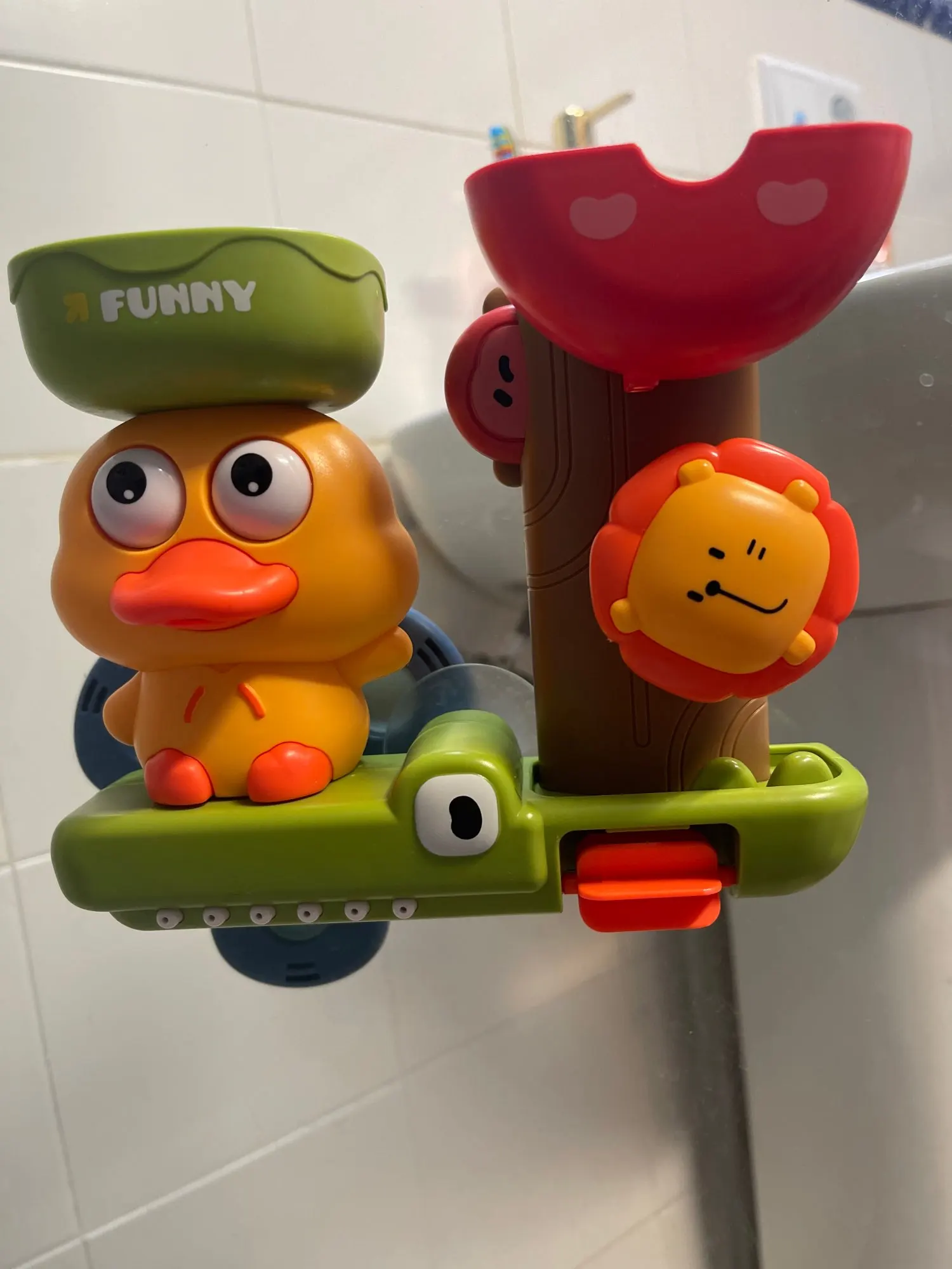Designed for safety and endless fun, this waterwheel toy attaches securely with a suction cup and spins as water flows through it. Its bright duck and flower shapes stimulate curiosity, hand-eye coordination, and early learning during bath play.